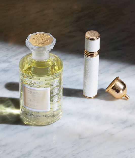 Enjoy more of what you love with an elegant flacon from The House of Creed. These larger fragrance bottles of 240ml or more are true statement pieces, lavishly adorned with a gold fleur-de-lis pattern that echoes the house’s royal connections throughout the ages, and its ongoing commitment to artistry and perfection. These bottles can be readily decanted into a luxurious complimentary 10ml re-fillable travel atomiser of choice for a little opulence on the go.