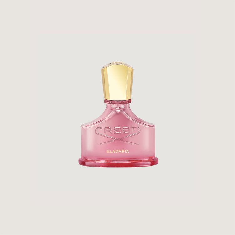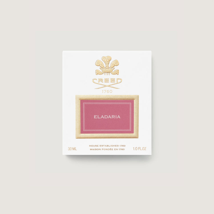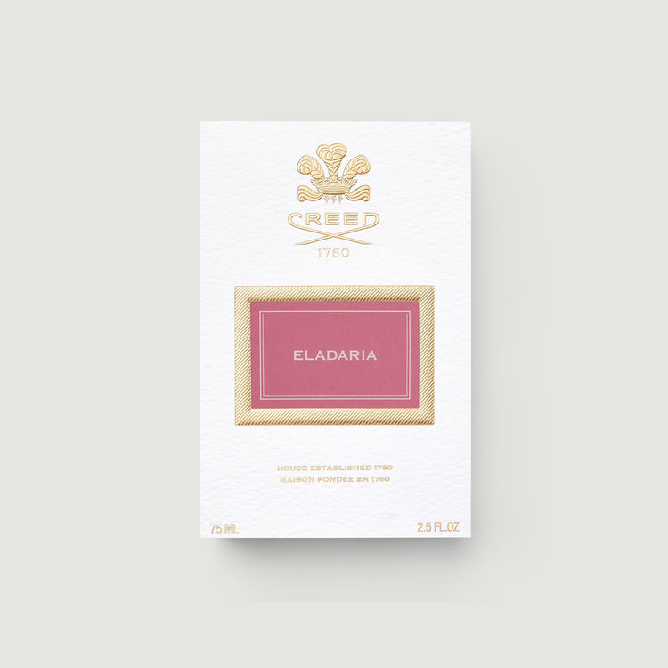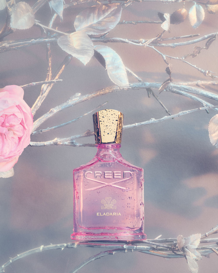 Eladaria is presented in the signature perfume bottle of The House of Creed, a timeless symbol of elegance that traces the shape of a classic hip flask. The design is both feminine and enchanting in a gentle petal pink hue that echoes the modern floral rose perfume contained within.